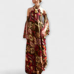 Tento ohromující maxi šaty s odnímatelnými rukávy spojují odvážnou eleganci s univerzálností. Mají stylový halter výstřih a jedinečné tribalistické detaily, což umožňuje snadný přechod z dne na noc.