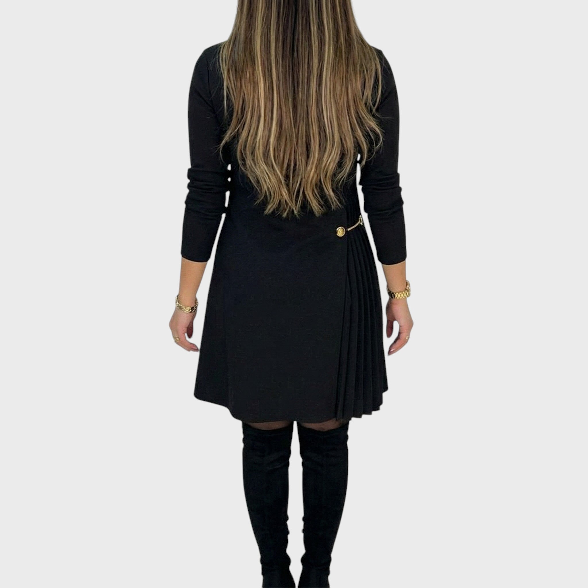 • Unikátní prvek: Asymetrická plisovaná část se zlatou ozdobou přitahuje pohledy a opticky tvaruje postavu.