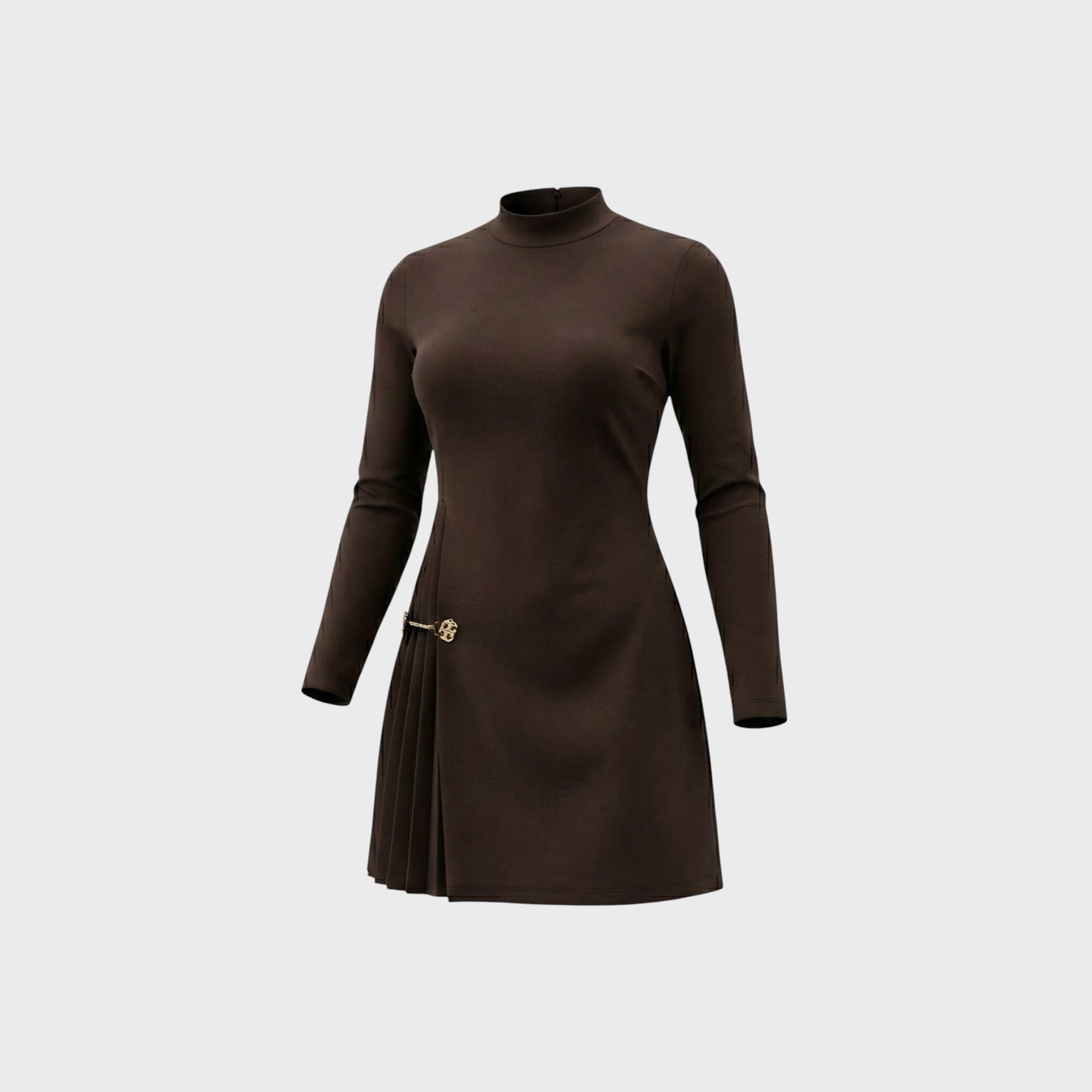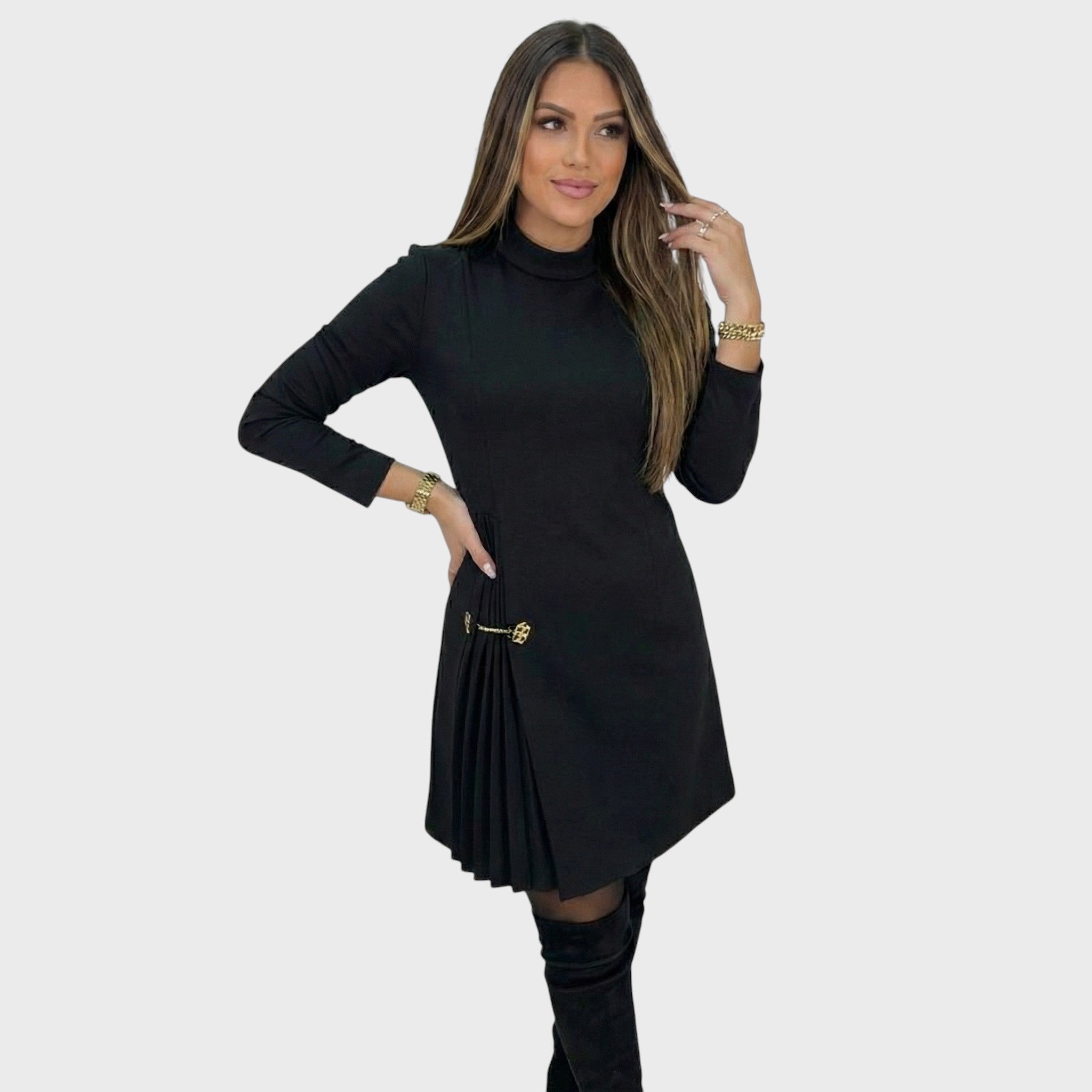 Hledáte šaty, které v sobě spojují jednoduchost s luxusním detailem? Model Sofia je navržen pro ženu, která chce působit sofistikovaně a zároveň se cítit pohodlně. Jemný stojáček a dlouhé rukávy vytvářejí elegantní siluetu, zatímco asymetrické plisování na boku, zdobené zlatou sponou, dodává šatům jedinečný šmrnc. Jsou perfektní volbou pro pracovní schůzku, večeři nebo jakoukoli společenskou událost, kde chcete zazářit.