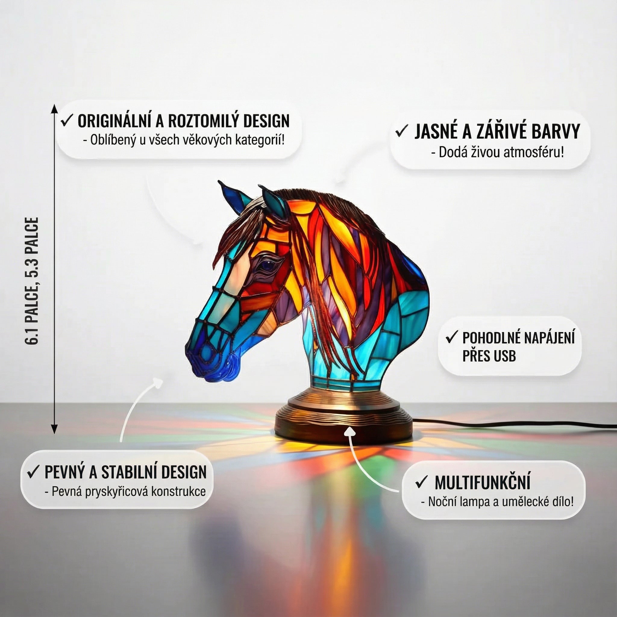 Naše Lampa Dama, inspirovaná nadčasovým stylem vitráže, je dokonalým doplňkem pro vytvoření elegantní a útulné atmosféry ve vašem domově. Její jemný, ale výrazný design a geometrické barvy přitahují pozornost a promění každý kout na stylové a přátelské místo. Osvětlete svůj prostor s šarmem a originalitou.