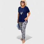 Tato dvoudílná souprava je dokonalým spojením elegance a komfortu. Její lehký a vzdušný materiál je příjemný na dotek a zaručuje, že se v ní budete cítit skvěle po celý den. Krásně tvarovaný střih s širokými kalhotami a stylovým topem vytváří sofistikovanou, a přesto uvolněnou siluetu, která se hodí pro každou příležitost.
