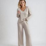 Tato stylová dvoudílná souprava spojuje volný top s výstřihem do V a rovné kalhoty, vytvářející moderní a pohodlný vzhled.